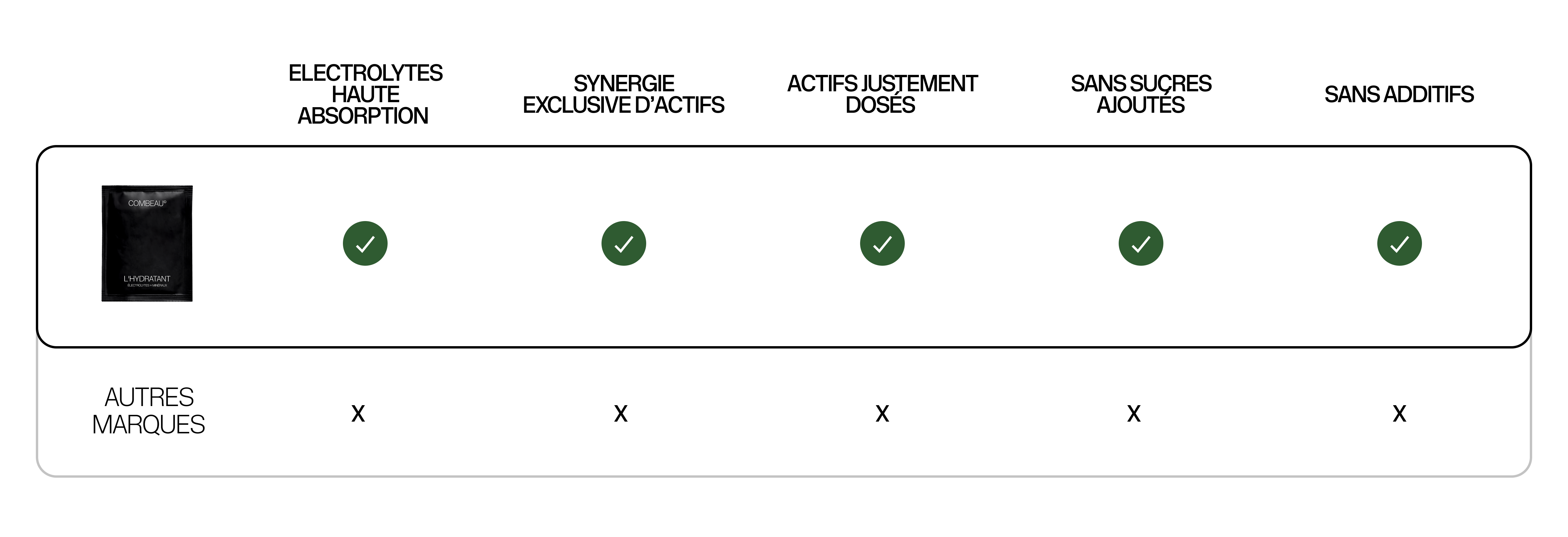 L’Hydratant, une formule universelle qui s’adapte à tous vos moments de vie en agissant à 360° sur tous les problèmes du quotidien dont vous ne saviez pas qu’ils étaient liés à la déshydratation (maux de tête, crampes, stress...).